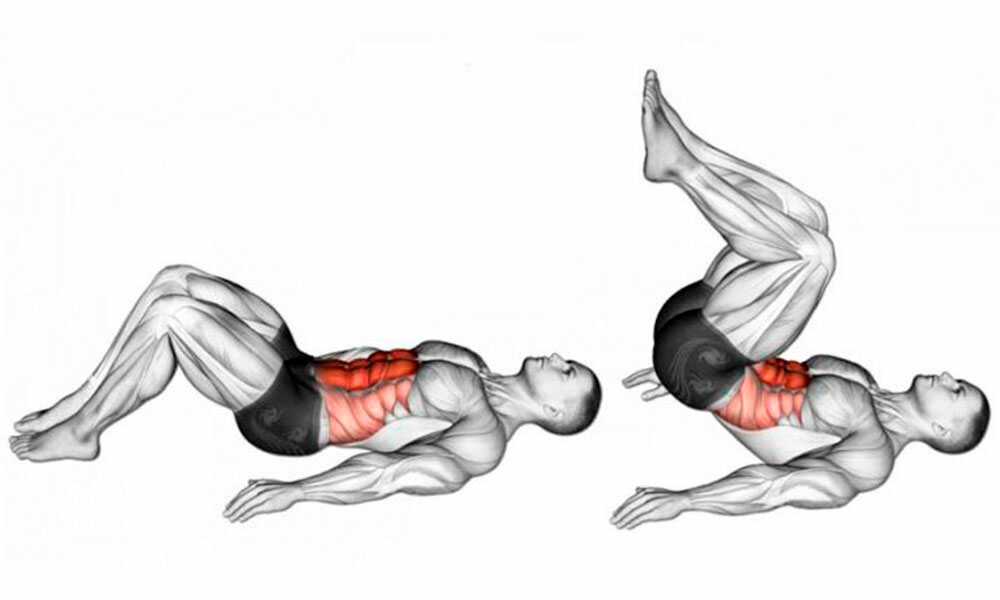 | С поднятыми ногами | Выполняется лежа на горизонтальной плоскости аналогично классическим скручиваниям, отличие только в том, что ноги во время всего подхода надо держать на весу. Для этого их необходимо согнуть на 90 градусов и в коленных, и в тазобедренных суставах, так, чтобы бедра в итоге были расположены вертикально, а голени — горизонтально |