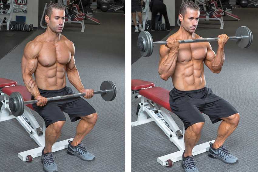 - Подъем штанги на бицепс — 2 подхода × 12-15 повторений.