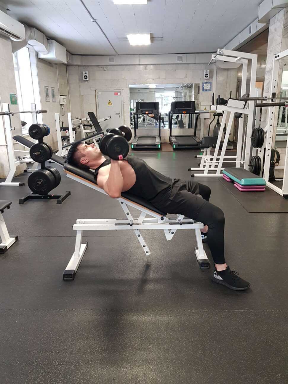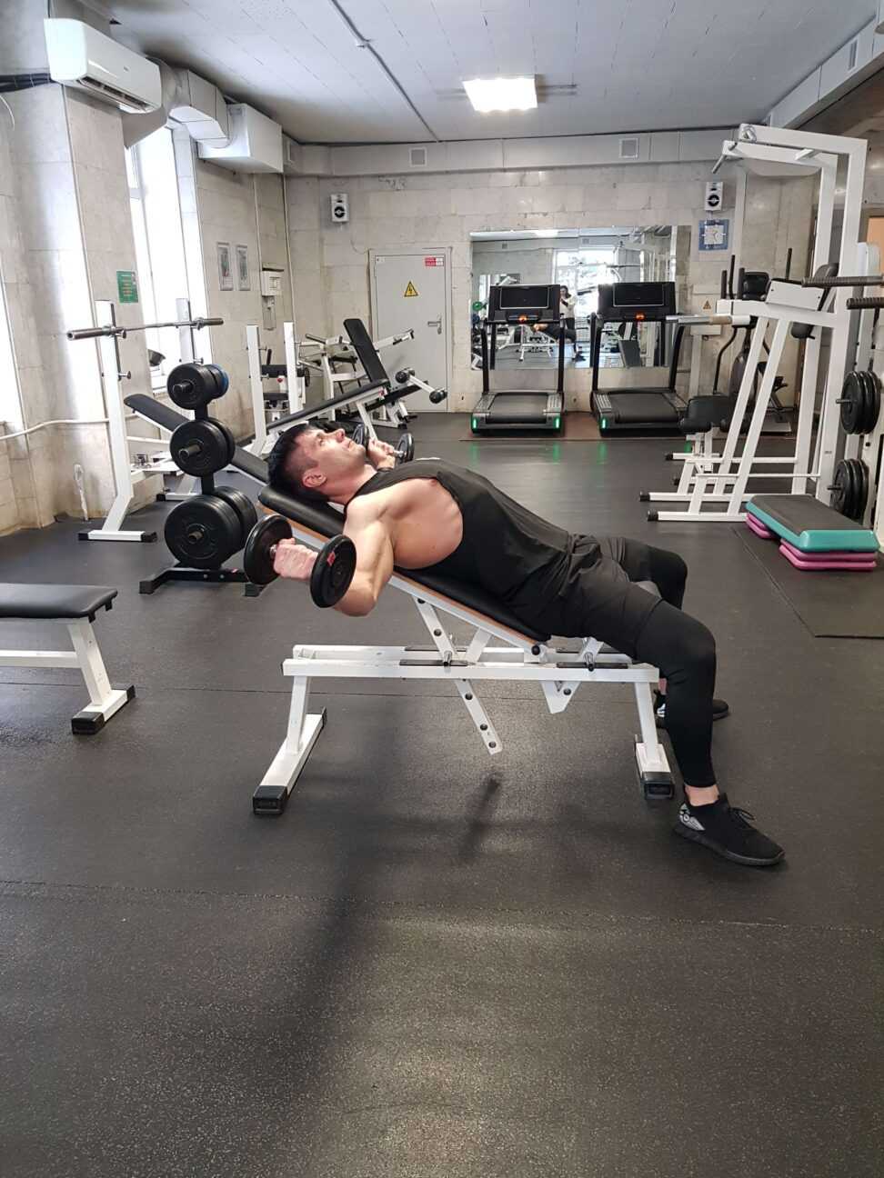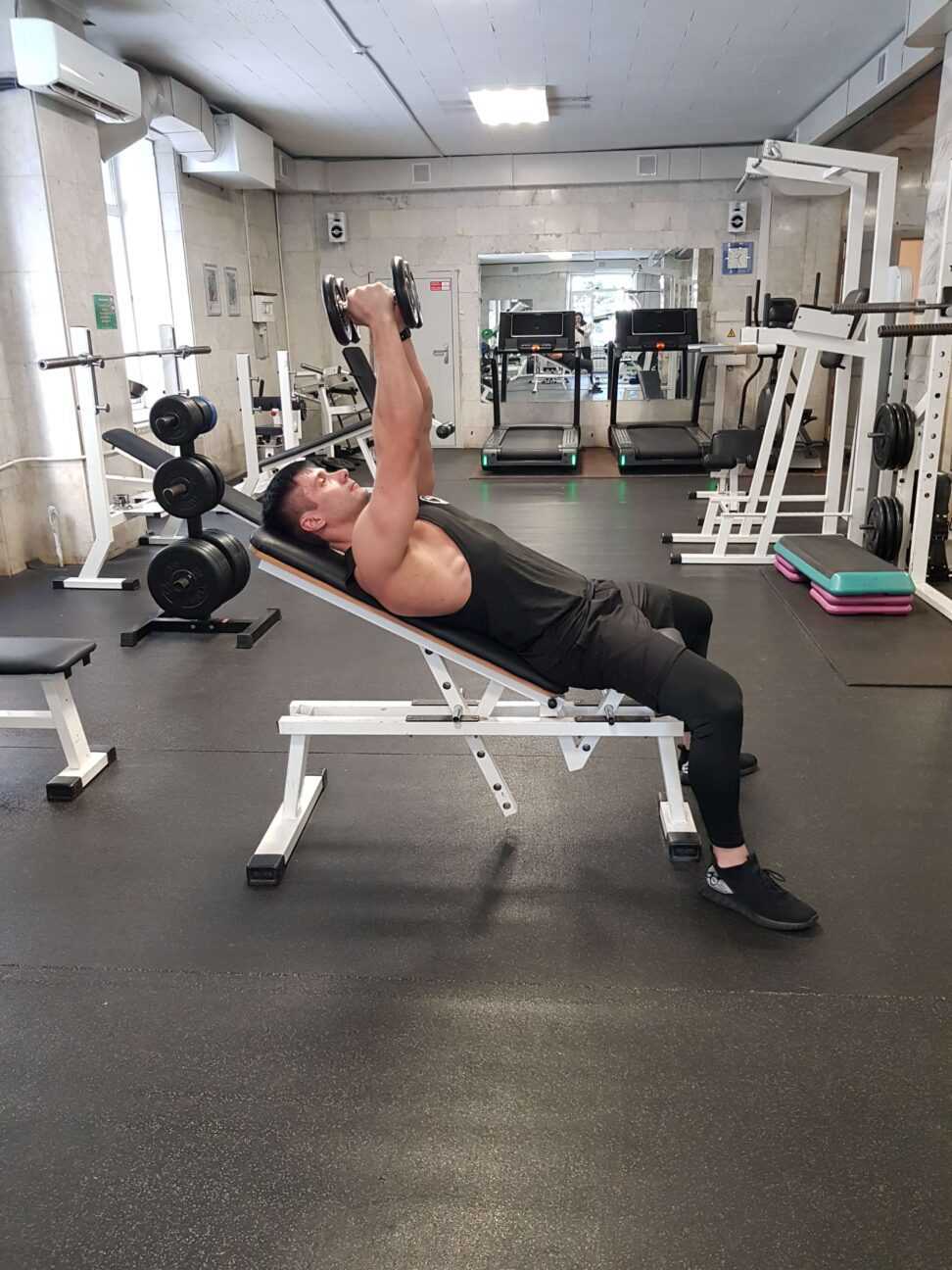 - Жим гантелей лежа на наклонной скамье — 2 подхода × 10-12 повторений.