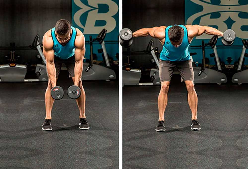 - махи гантелями в наклоне на заднюю дельту (дропсет).