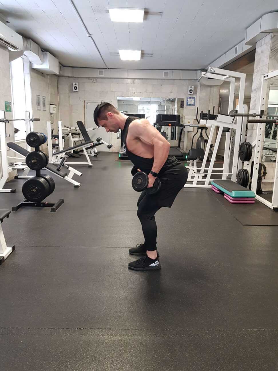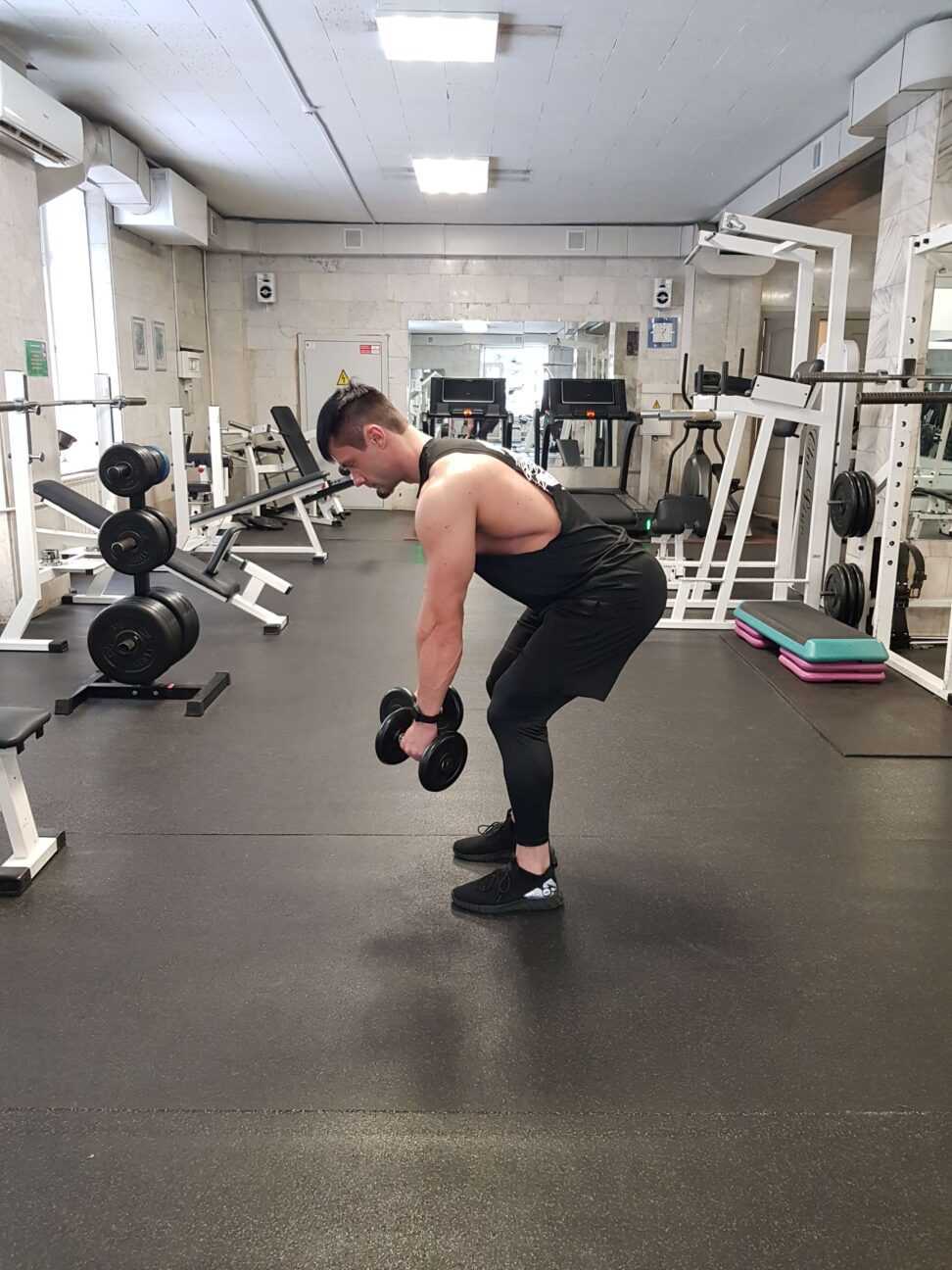 - Встать ровно, гантели в опущенных руках. Наклонить корпус вперёд, колени слегка согнуть.