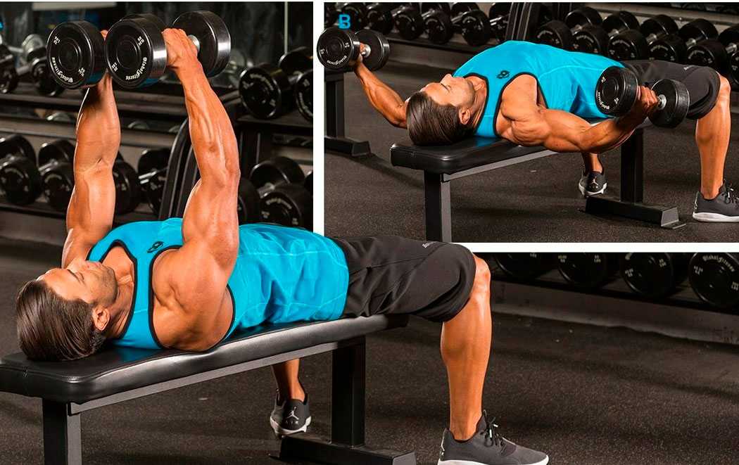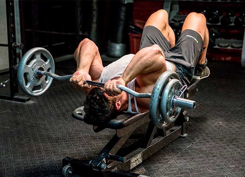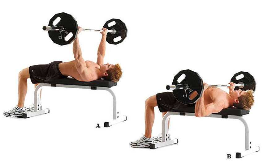 - Жим штанги лежа на горизонтальной скамье — 3 подхода × 8-12 повторений.
