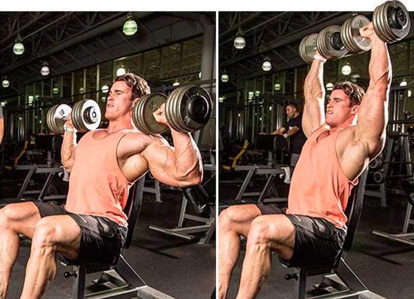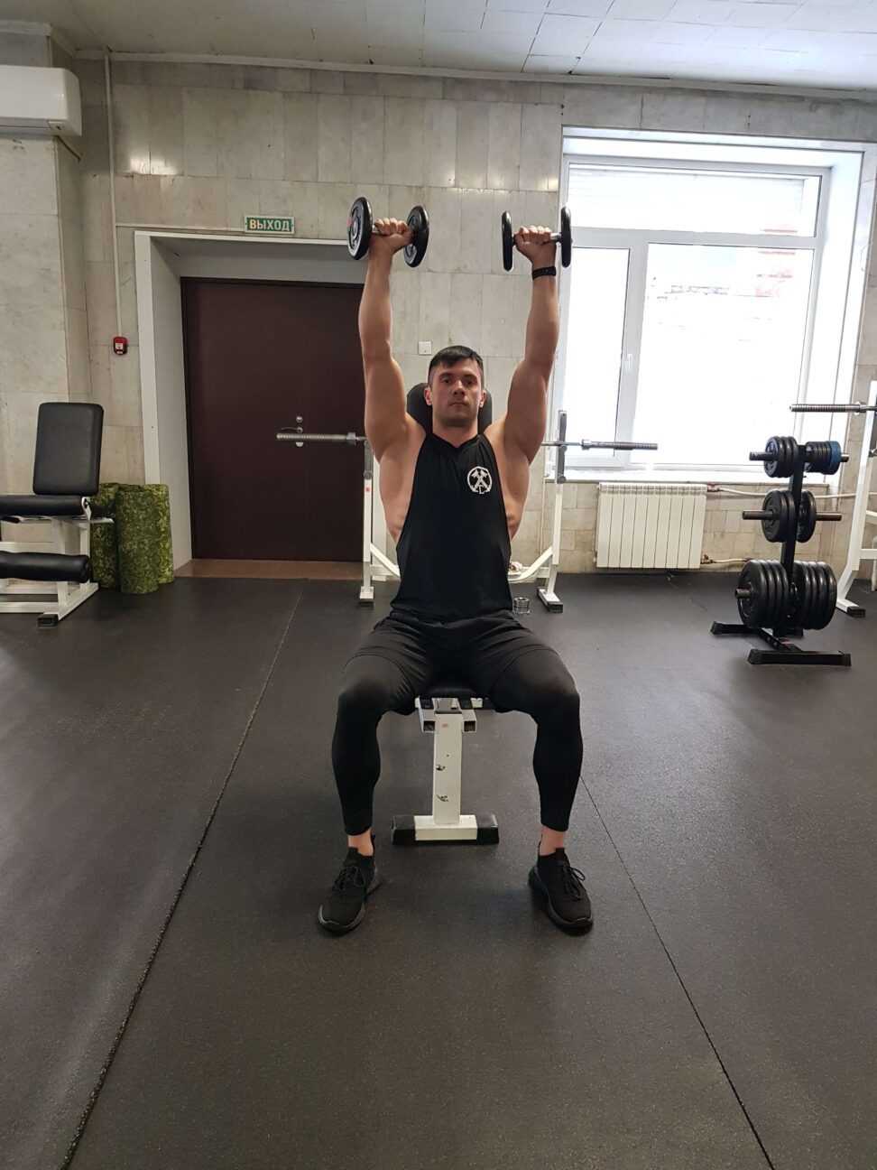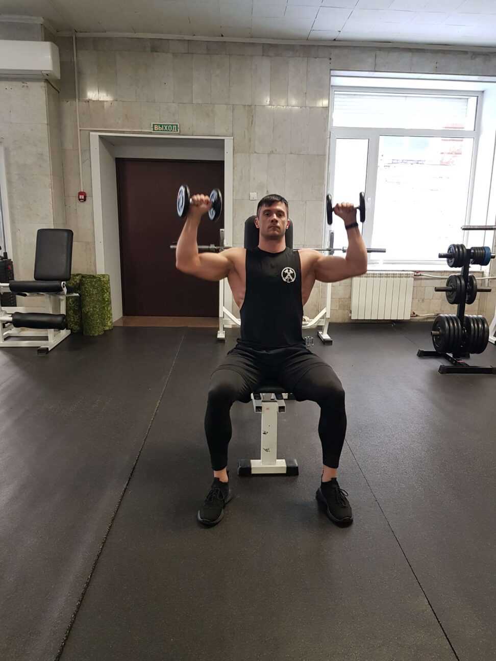 - Армейским жим штанги стоя — 3 подхода × 6-8 повторений.