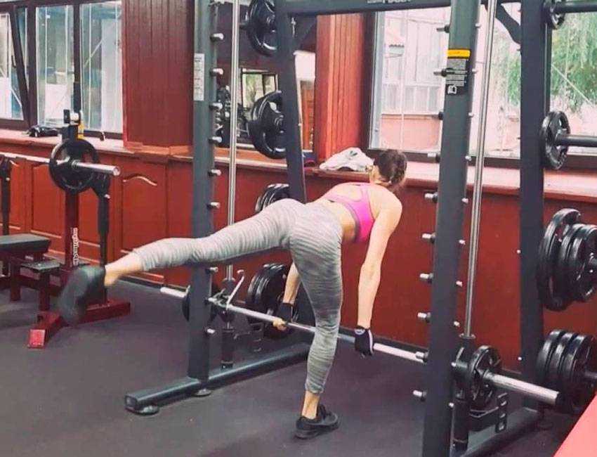 - Гриф штанги опускается не полностью – только до середины голеней. При этом нужно ощущать, как испытывают растяжку бицепсы бедра. Спина прогнута.