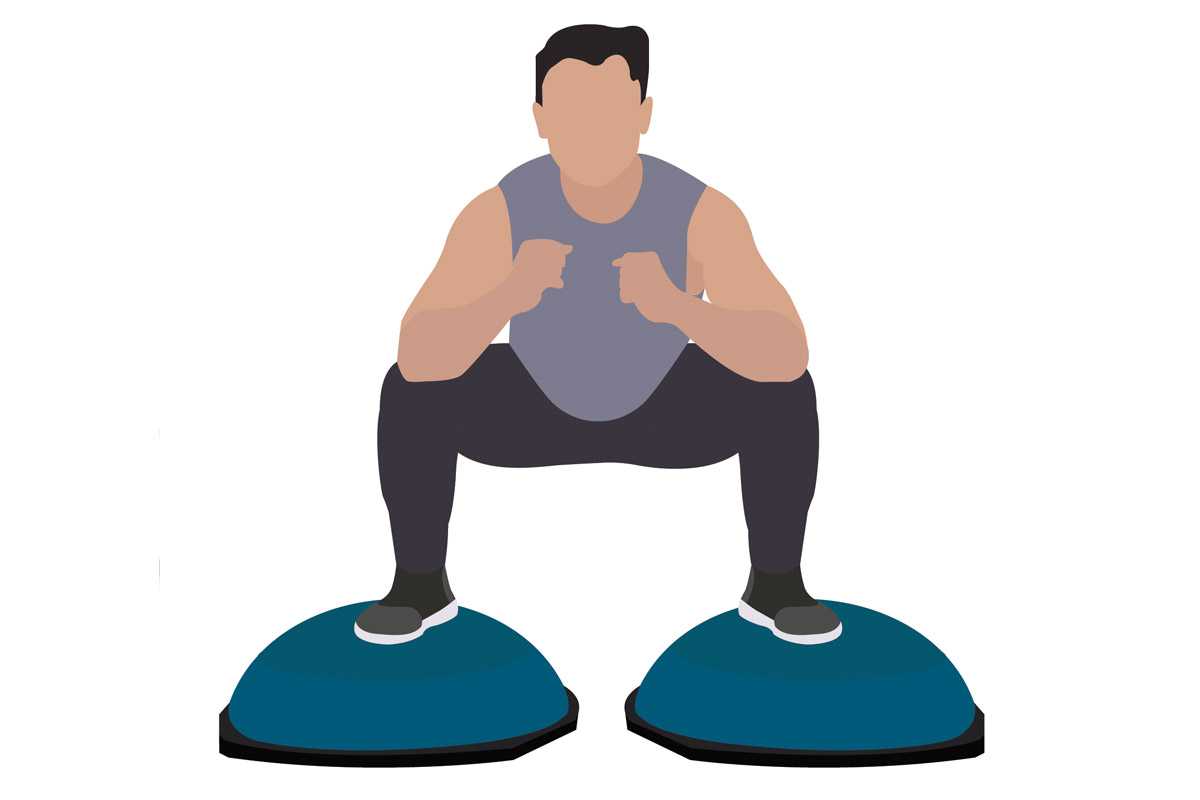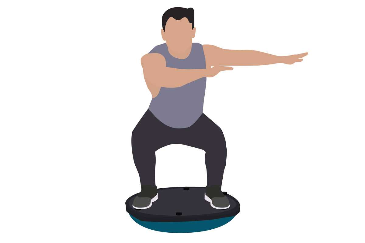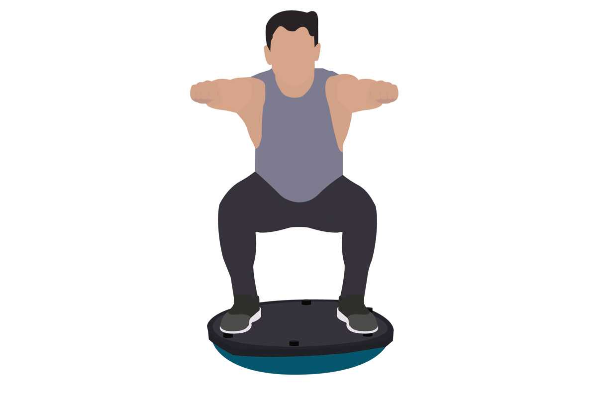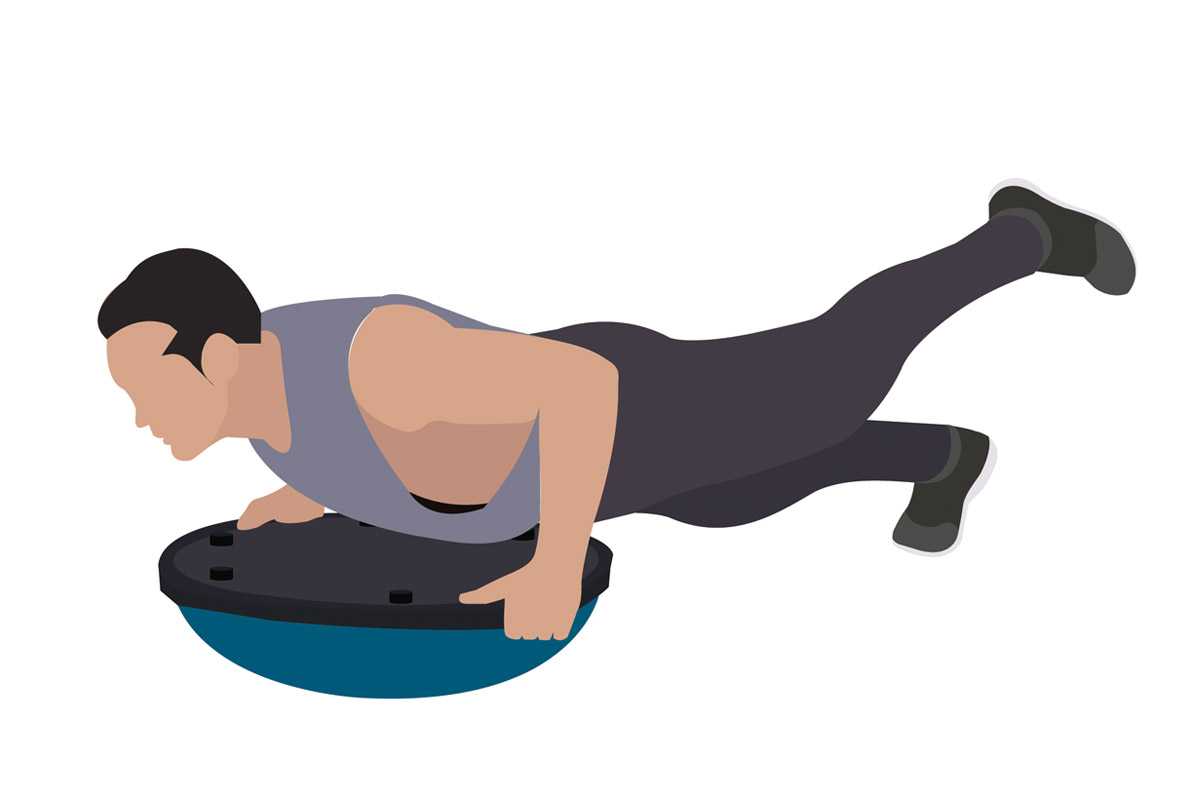Исходное положение — полуприсед на двух полуплатформах бозу, прямые руки вытянуты вперед. Сожмите ягодицы вместе, напрягите пресс, после чего поднимите одну ногу вверх — задержитесь на 2-3 сек и опустите. Выполняйте 12-15 раз для каждой ноги.