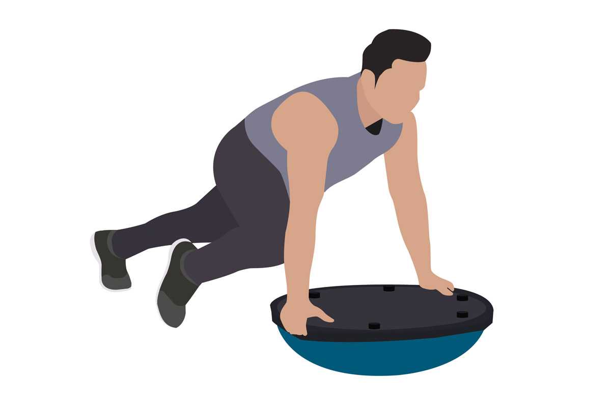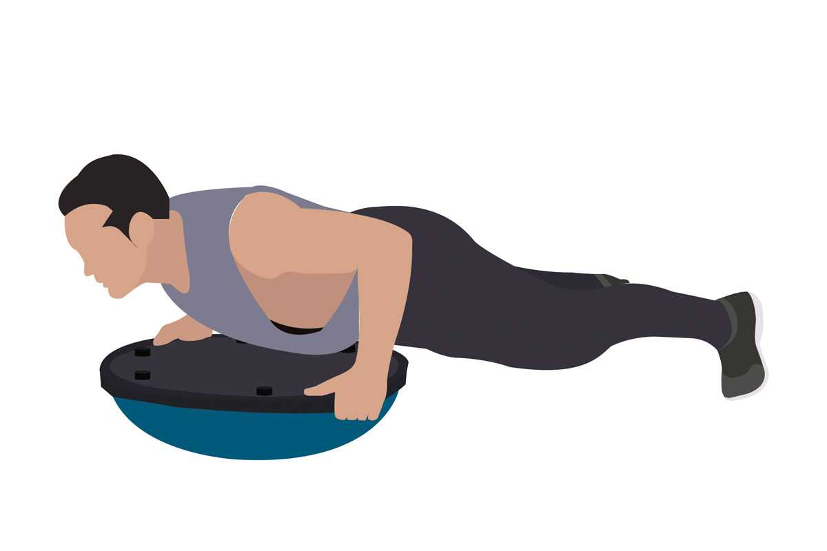 Расположите платформу мягкой стороной вниз, затем возьмите ее двумя руками. Следите за тем, чтобы тело было вытянуто в линию — ягодицы и пресс должны быть в осознанном напряжении. Медленно совершайте отжимания, в верхней точке отталкиваясь от бозу как можно сильнее.