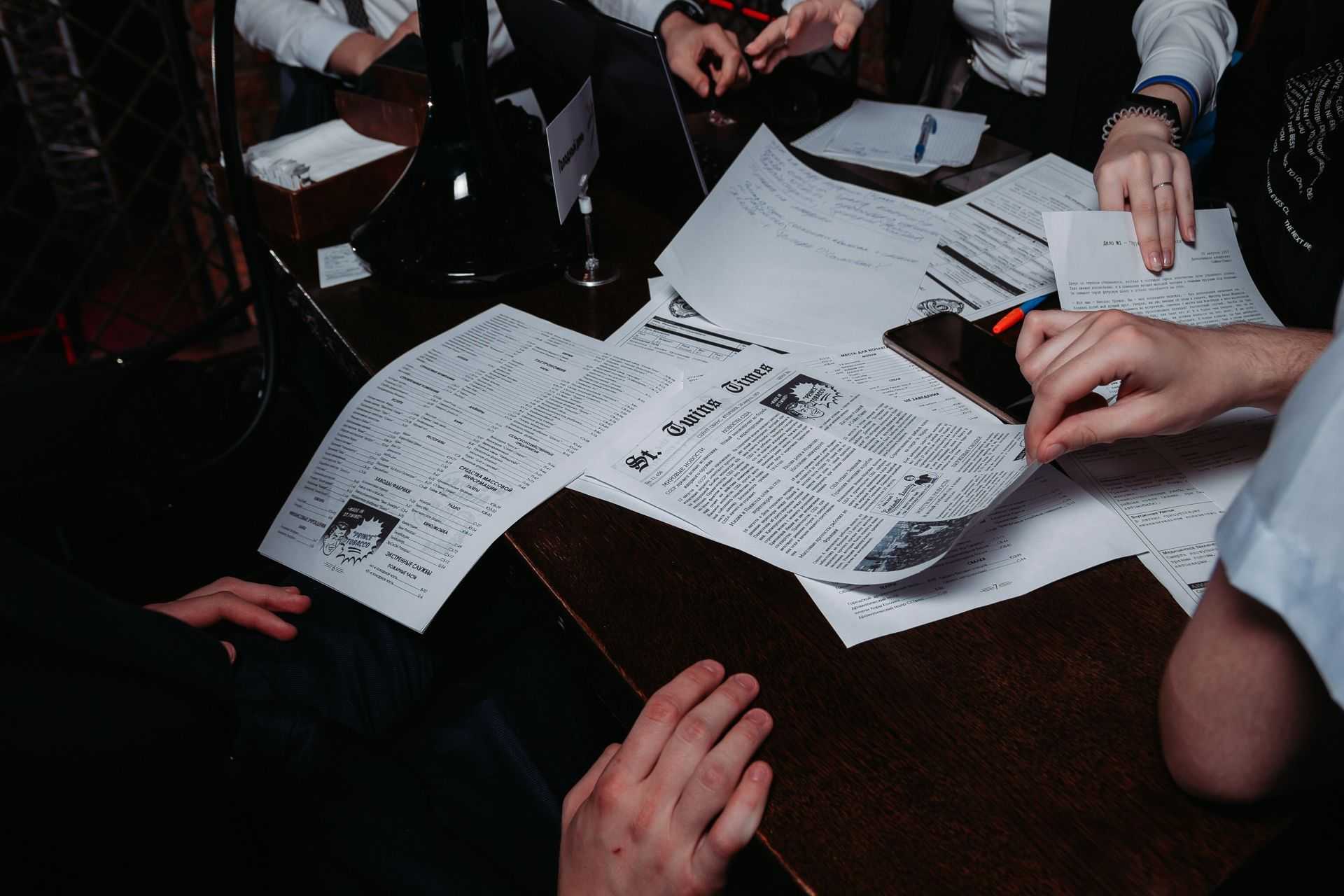 Музыка, антураж — соответствующие. Почти никакого конферанса, эге-гей аплодисментов и «заводилова» — только полумрак, а на столах команды — полицейские отчеты, протоколы судмедэкспертов, выпуски газет и «адресная книга» с шифрами (плюс ведущий изредка дает пространные подсказки).