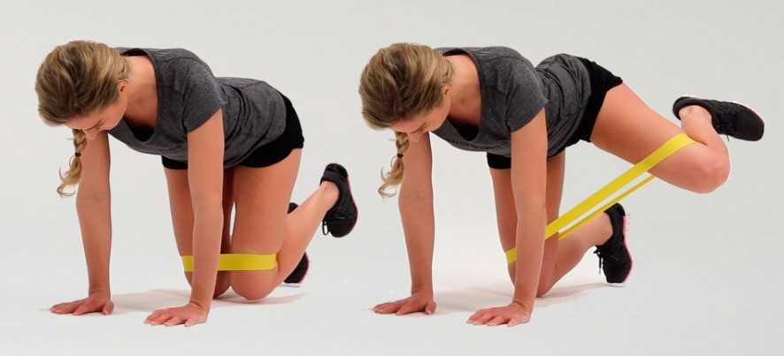- С выдохом поднимите рабочее бедро до параллели с полом, натягивая резинку за счет квадрицепса.