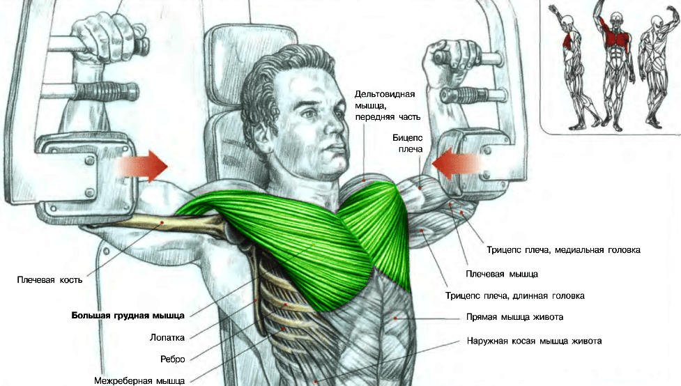 Анатомически оптимальная позиция – кисти располагаются в плоскости средней линии груди. Сведение должно производиться по дугообразной траектории перед грудью. Если конструкция тренажера подразумевает возможность упора в мягкие валики предплечьями, локоть должен находиться на средней линии груди.
