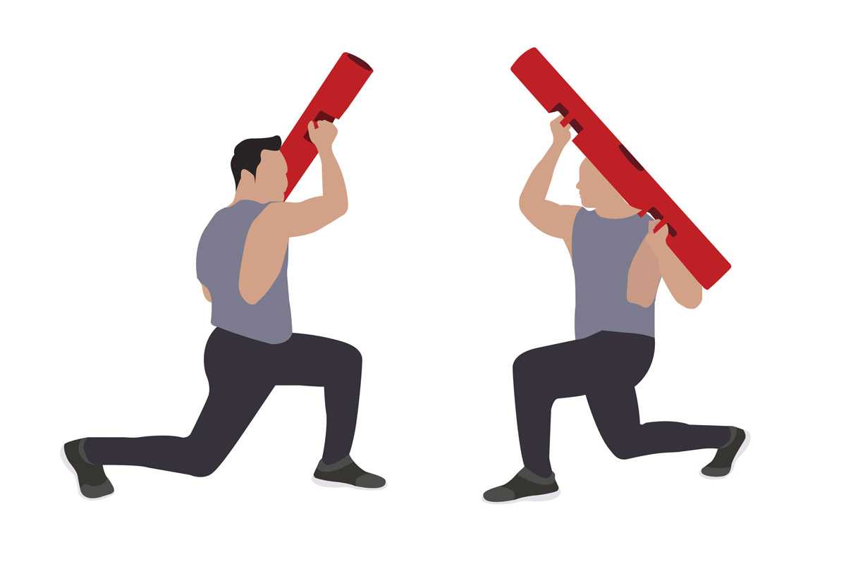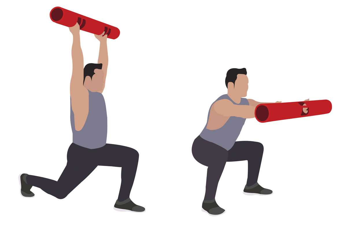 Функциональное упражнение, сочетающее сразу несколько типов движений — и требующее работы мышц всего тела. Во-первых, необходимо совершать поочередные выпады ногами (развивает ягодицы). Во-вторых, нужно выполнять поворот корпуса с бодибаром в руках (развивает пресс и плечевой пояс).