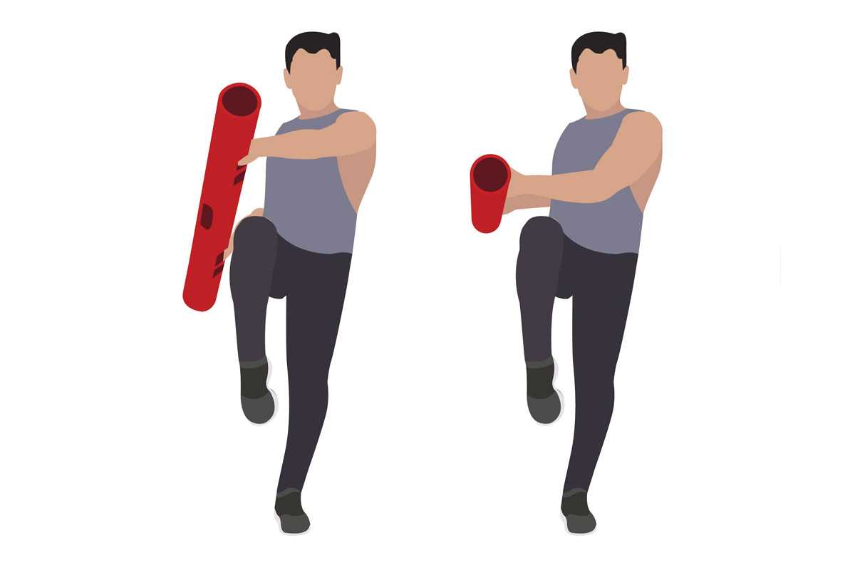Исходное положение — стоя на одной ноге, вторая согнута в колене и поднята до уровня пояса. Корпус повернут в стороны, руки держат бодибар. Затем, не меняя позиции ног, двигайте бодибаром, подобно веслу. Следите за тем, чтобы тело не было перекошено влево или вправо.