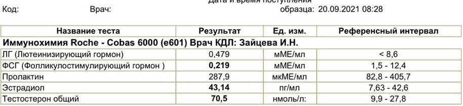 Достаточно показательный вариант неграмотного выбора времени для ПКТ. Длительность курса 11 недель, нандролон (дека) 250 мг, а также сустанон 250 мг в неделю. 27 августа были последние инъекции. ПКТ человек начал с 10 сентября, принимал клостилбегит (уже ошибка в выборе дня начала восстановления), по анализам также видно, что еще на 20 сентября уровень тестостерона большой. Обратился ко мне за помощью в грамотном восстановлении. Решение было очевидным: полная отмена кломида, пока тестостерон не вернется в низы референтных значений, после начать применять клостилбегит и дополнительные препараты, корректируя при этом уровни эстрадиола и пролактина.
