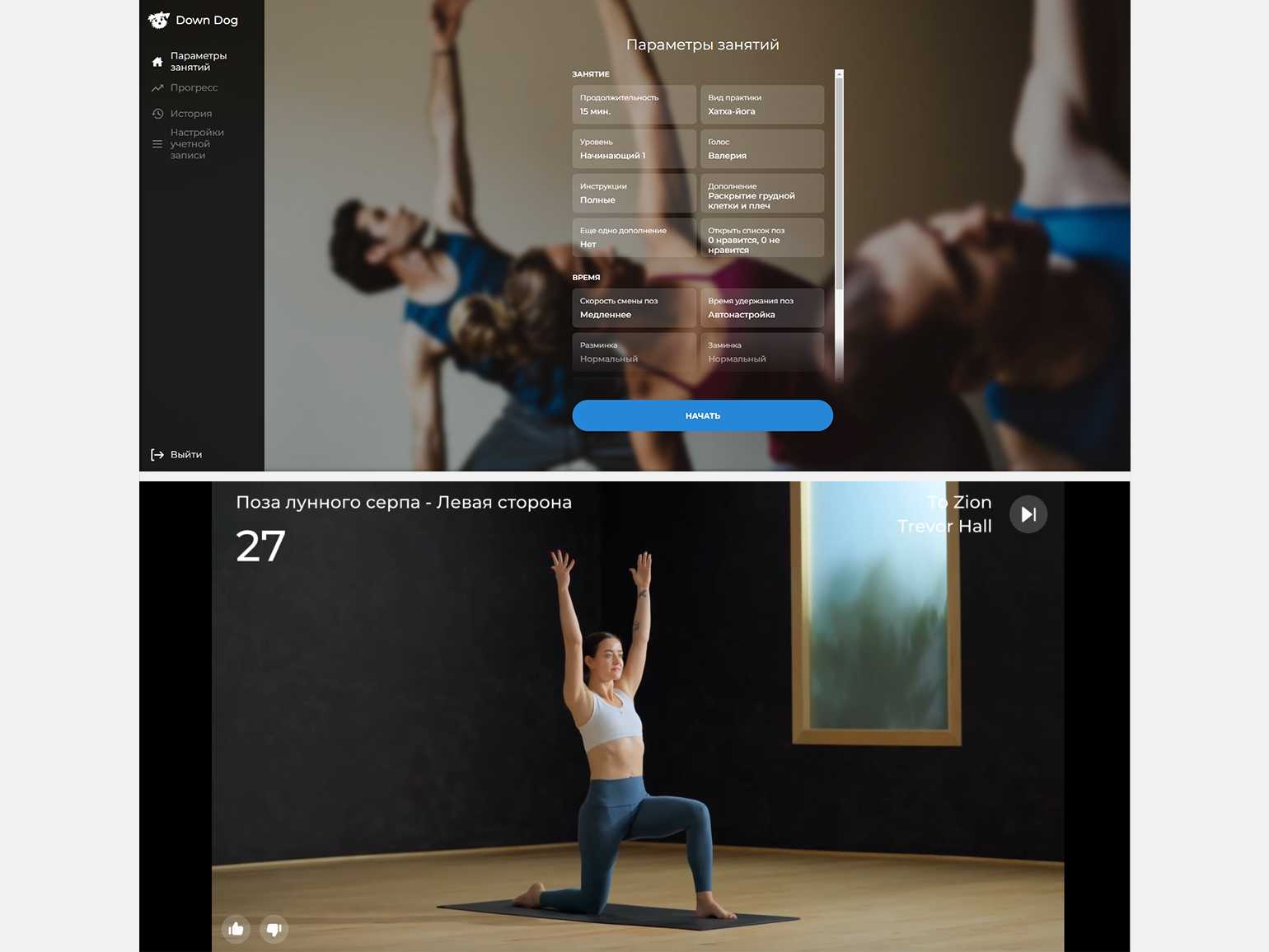 Тренировки группируются по виду активности или по зонам, которые нужно проработать, например грудь или плечи. После запуска технику упражнения показывает анимированная фигурка, либо можно переключиться на видео с YouTube. Голос диктора подсказывает, когда начинать и заканчивать упражнение. Озвучка на русском здесь автоматическая, как в «Google Переводчике».