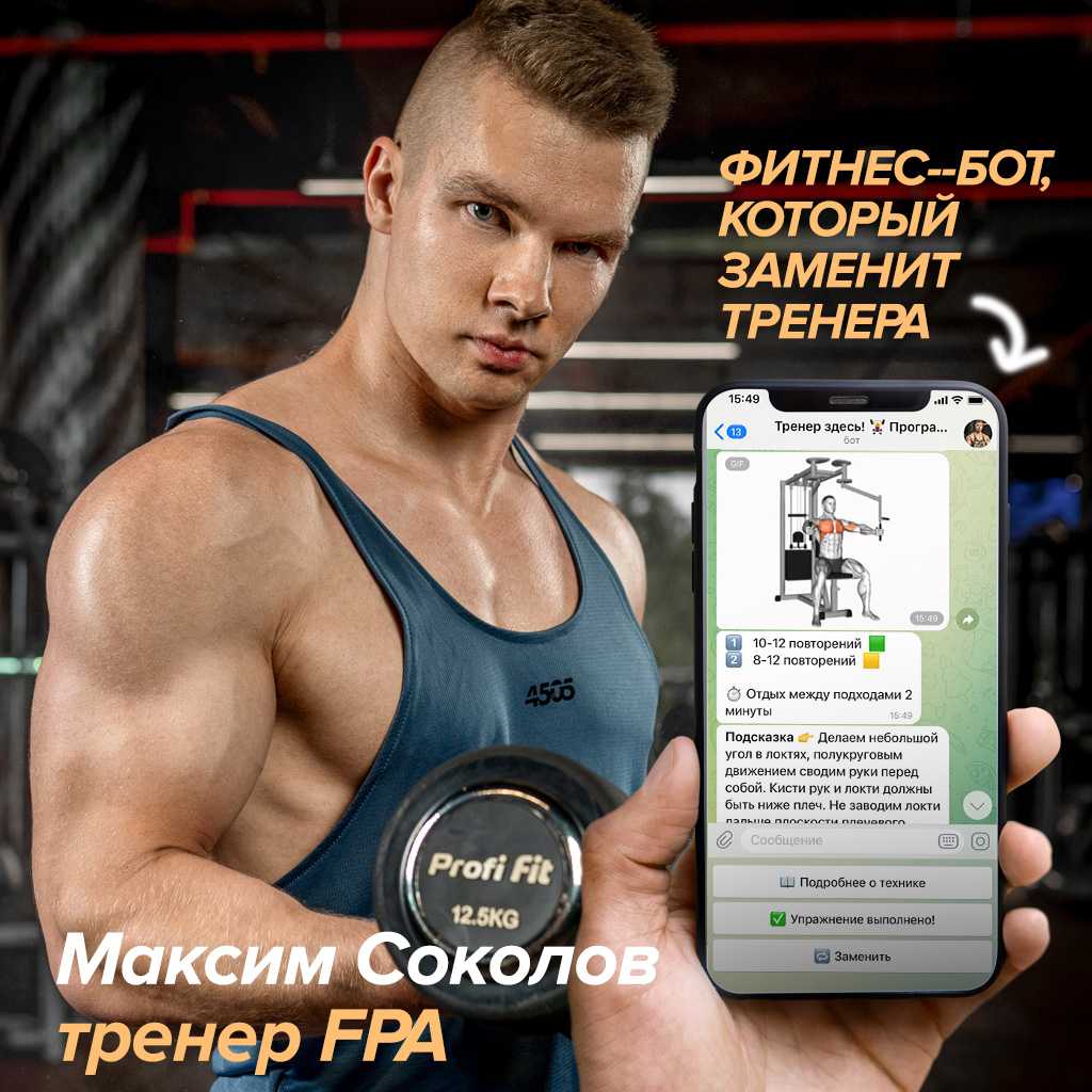 Программы тренировок в современном формате фитнес-бота для эстетичного развития фигуры (широкий верх — узкая талия). Для новичков и опытных. От сертифицированного тренера FPA Максима Соколова