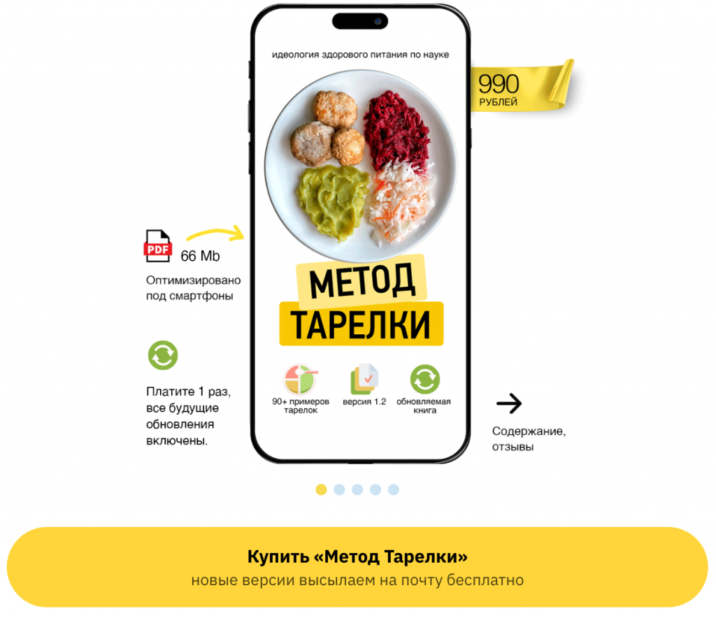 Кстати, еще один вариант здорового питания без подсчетов — Метод Тарелки на основе Гарвардской тарелки, но с книгой и почти 100 примерами готовых тарелок. Собственно, эту книгу создала и постоянно обновляет команда Зожника:
