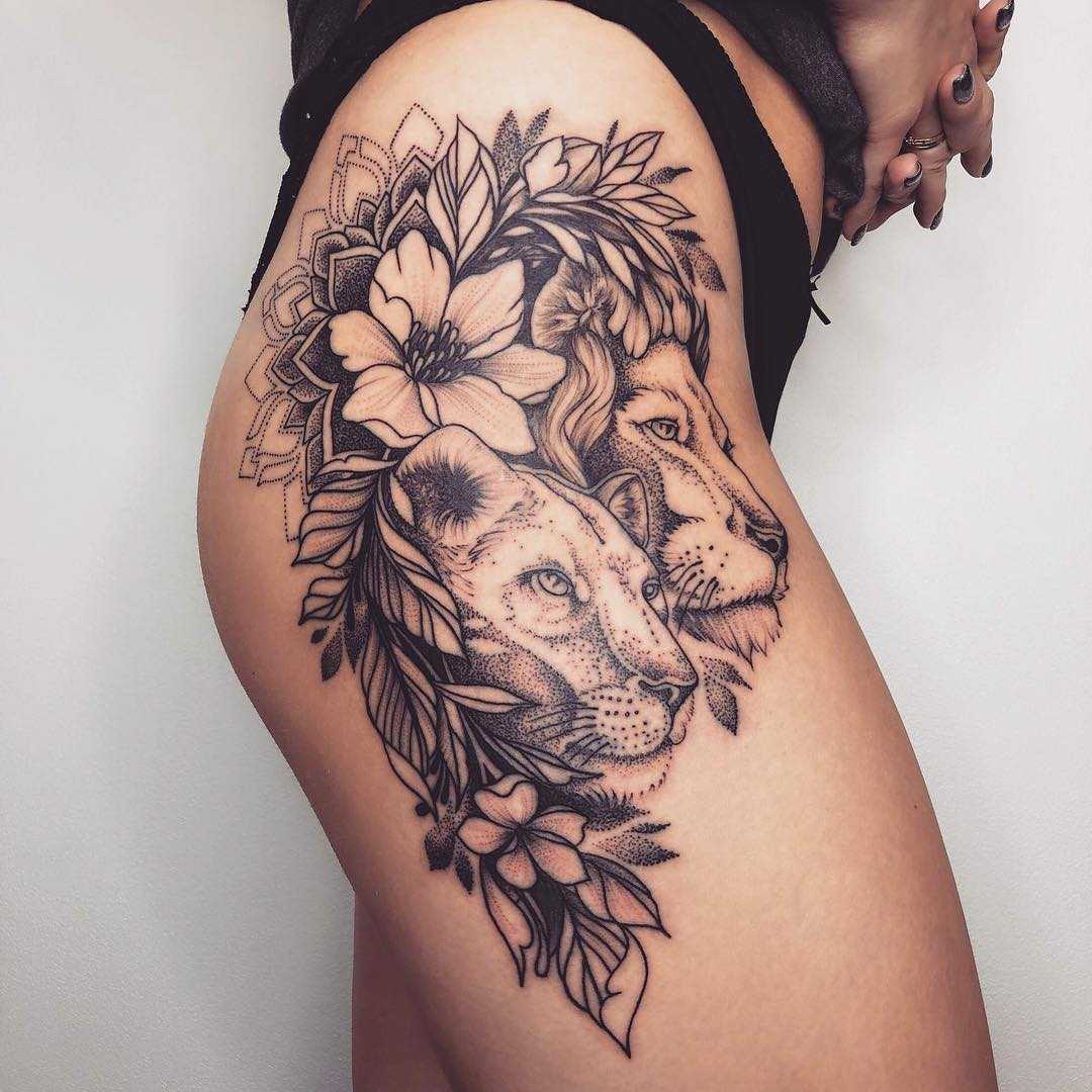 Наиболее часто девушки выбирают рисунок льва или даже двух. Несмотря на то, что такое изображение больше свойственно мужчинам, на женском бедре оно смотрится превосходно. Что касается его значения, то в основном оно заключается в мужестве, благородстве, силе и смелости. Согласно некоторым трактовкам, лев также может быть символом материнства и семейного благополучия.