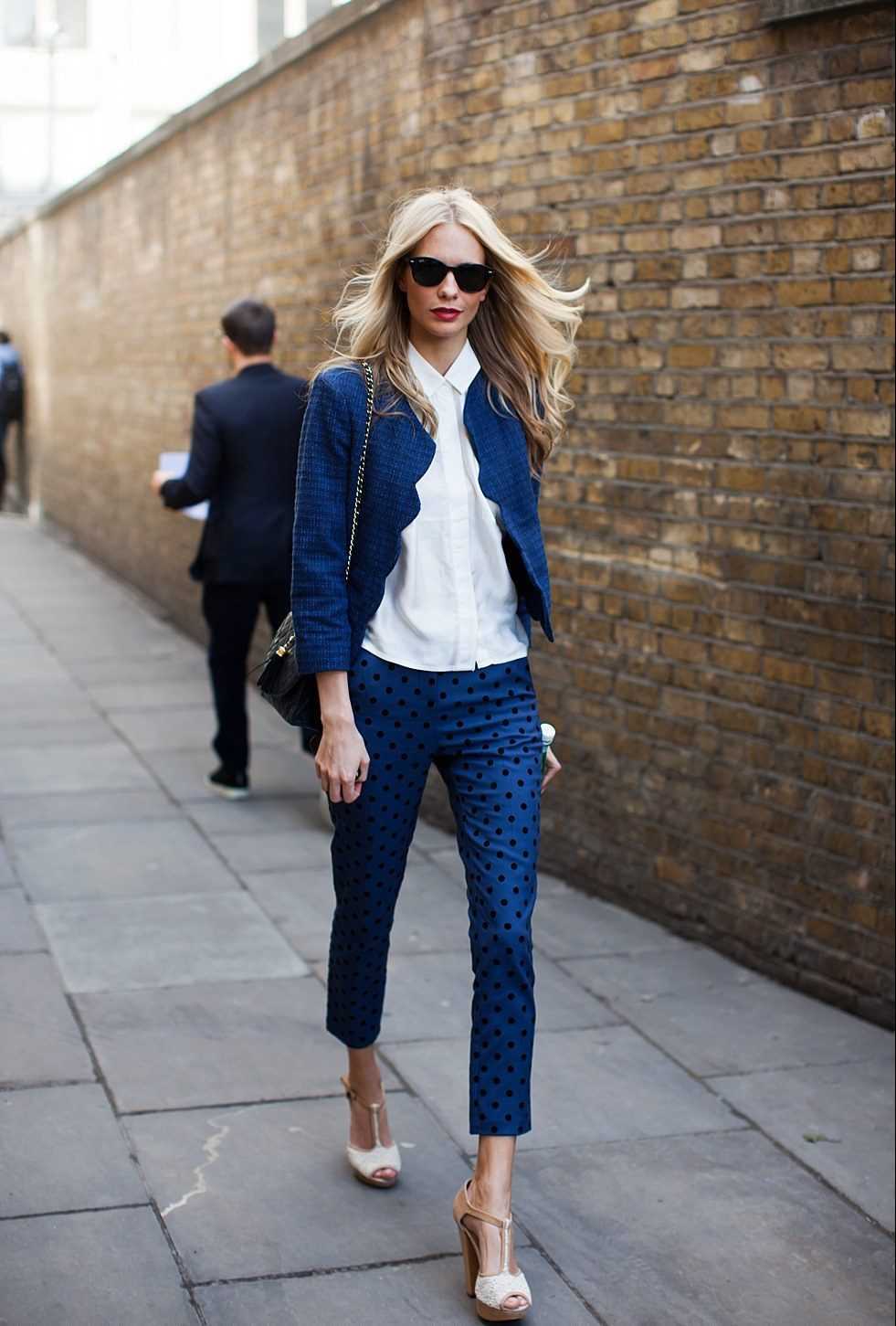 Чтобы создать необычный деловой лук, можно подобрать белые брюки со стрелками и дополнить их укороченным жакетом такого же цвета. Лук украсят лодочки в классическом стиле. Блузка или топ могут иметь любой оттенок. Отличным решением станут черные, синие, красные модели. Не менее стильно выглядят пастельные тона.