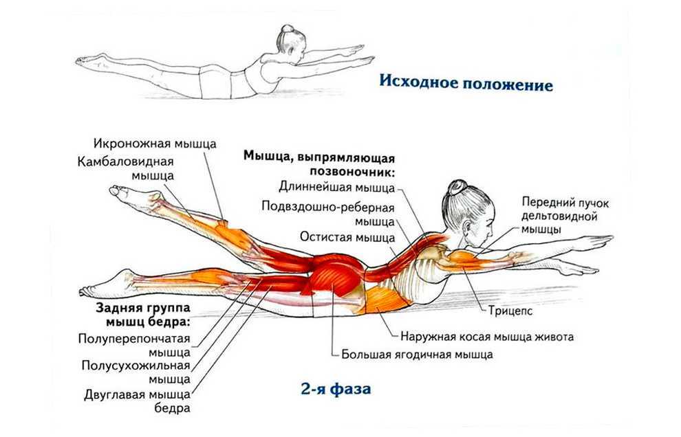 Лягте на живот, выпрямитесь от головы до стоп, носки вытяните. Расправьте по сторонам руки, ладони поверните вниз. Сделайте гиперэкстензию: верх корпуса поднимите от пола, прогнувшись в пояснице. Нижняя часть тела прижата к полу. Дают такие подъемы нагрузку на спину, укрепляя мышцы по всему позвоночнику. Уходит сутулость и боль в грудном отделе.