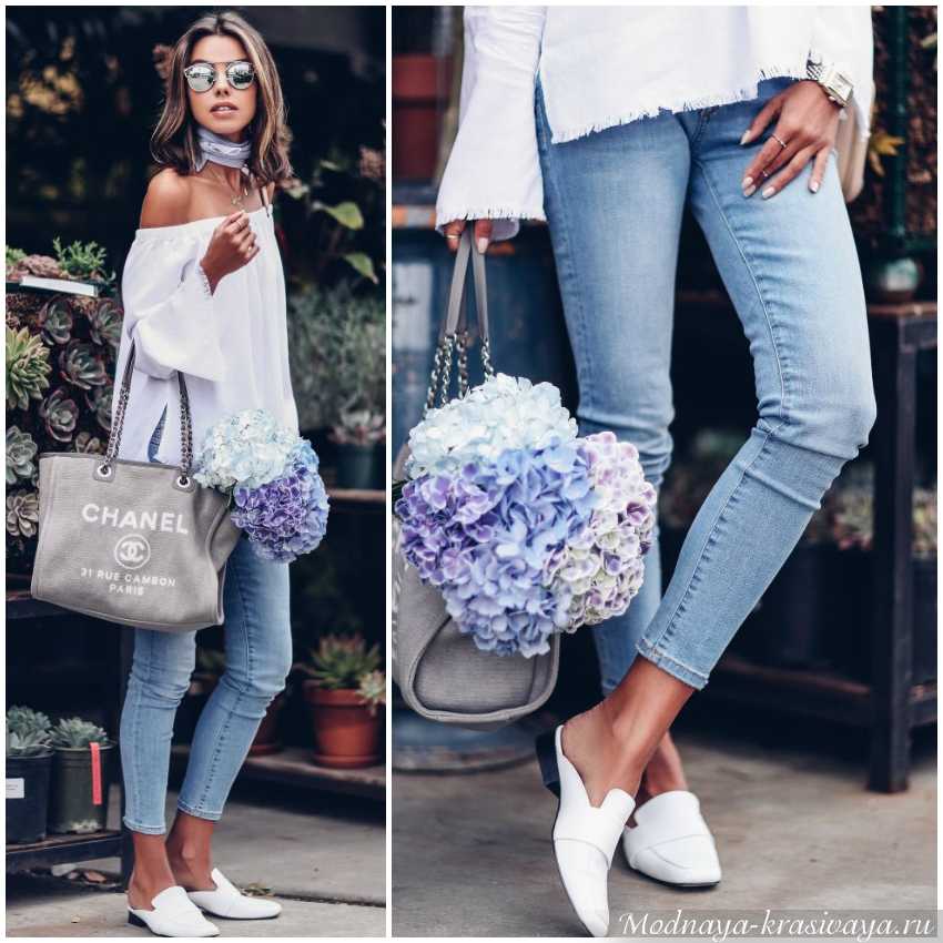 Летний вариант. Он прекрасен, хотя и не всегда практичен. Создать игривый ансамбль можно, дополнив скинни футболкой яркого цвета и кедами. А нежная кружевная блузка пастельных тонов в сочетании с белоснежными скинни и элегантным жакетом – удачный офисный вариант.