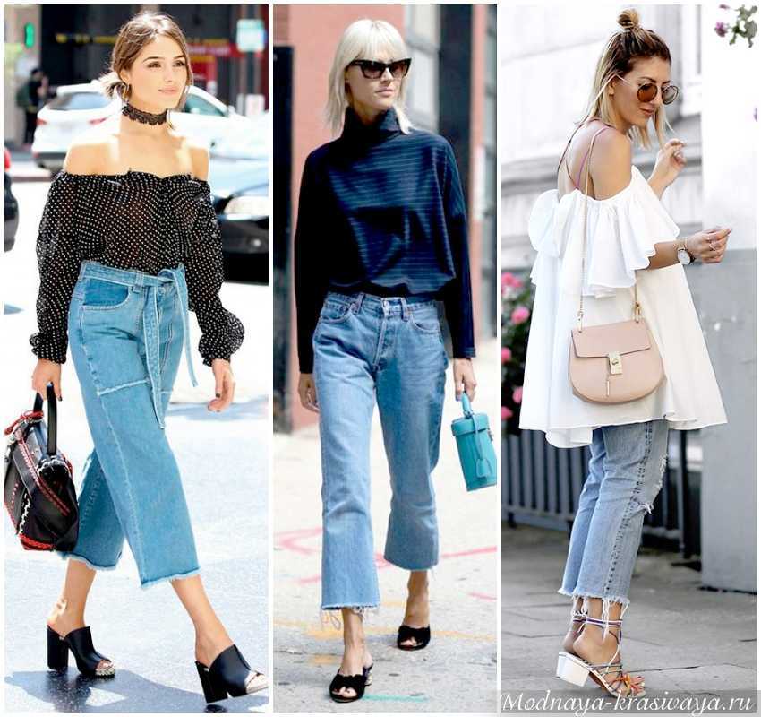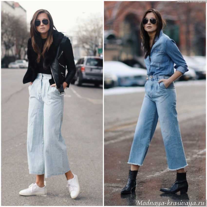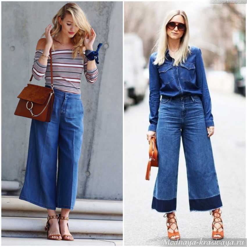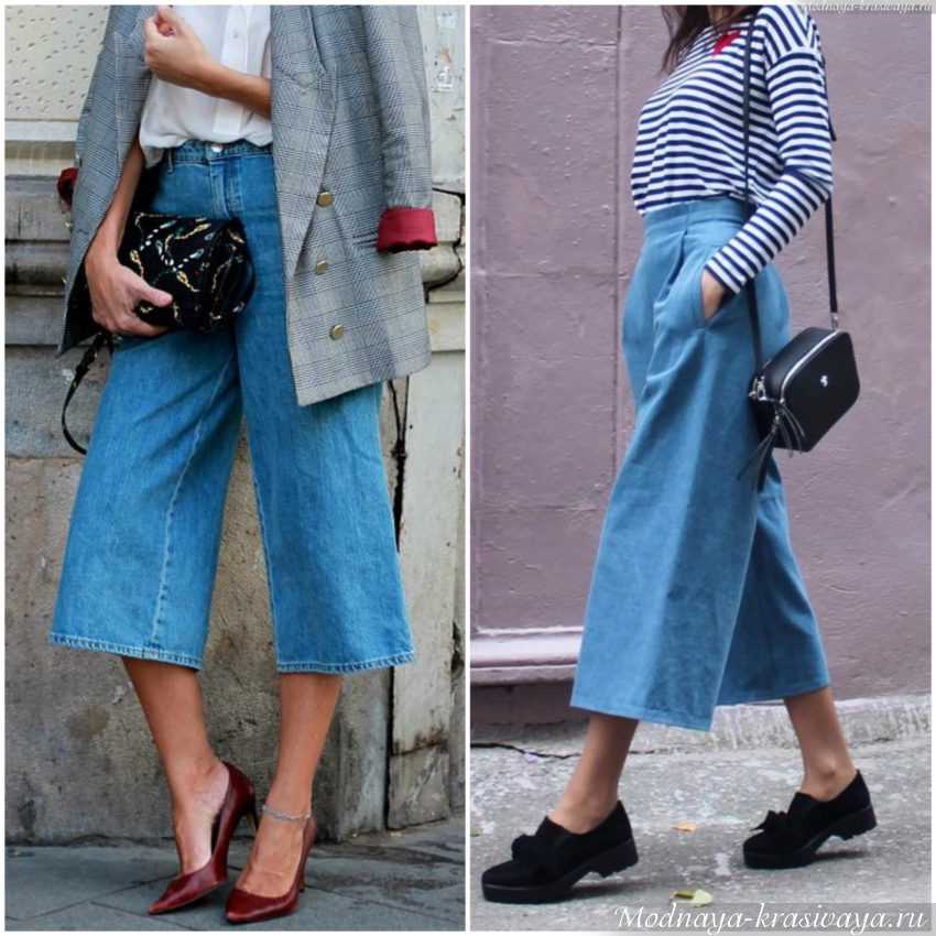 Укороченные и модные кюлоты. Длина таких джинсов заканчивается у голени, расширение может варьироваться от небольшого до экстремально широкого.