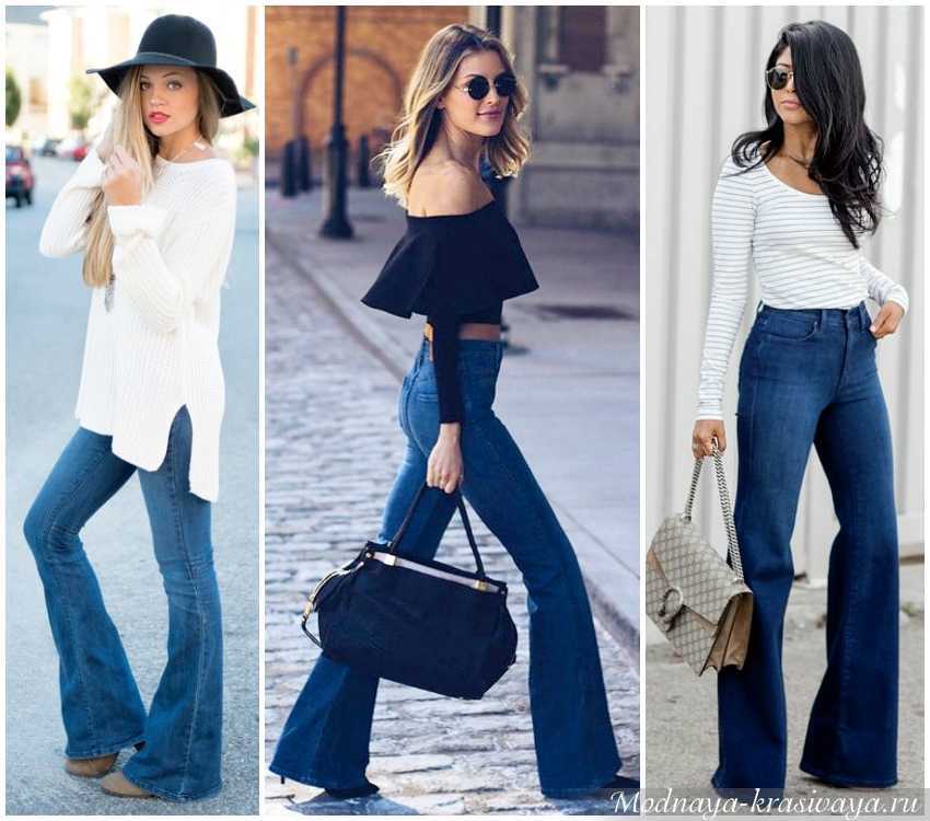 Преимуществом и несомненным плюсом широких брюк является то, что такие джинсы отлично смотрятся на любой фигуре, эффектно подчёркивают талию, красиво сочетаются с летними майками и топами, спортивной обувью и модными в новом сезоне сандалиями и босоножками на толстой подошве. Этот стиль подходит, как юным девушкам и солидным дамам.