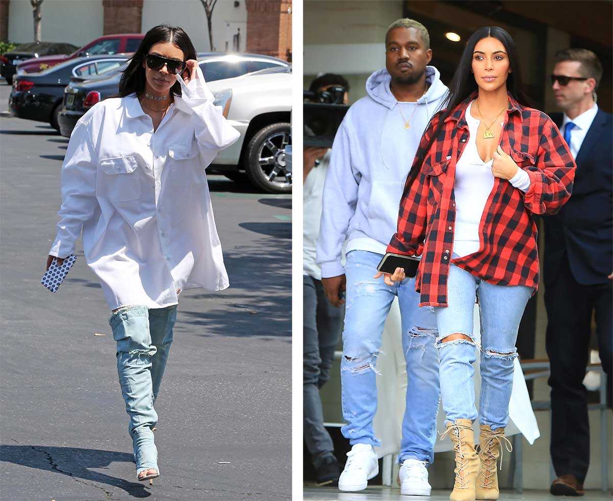 Свои сверхженственные формы Ким научилась не только не прятать, но и демонстрировать в лучшем свете. Как ей это удалось? Звезда любит собирать свои аутфиты из мужских вещей, в том числе находя их в шкафу своих звездных мужей. Чаще всего на ней можно увидеть мужские рубашки и оверсайз свитшоты, которые она без стеснения носит как платья, благодаря своему небольшому росту. Отличный лайфхак для миниатюрных девушек!