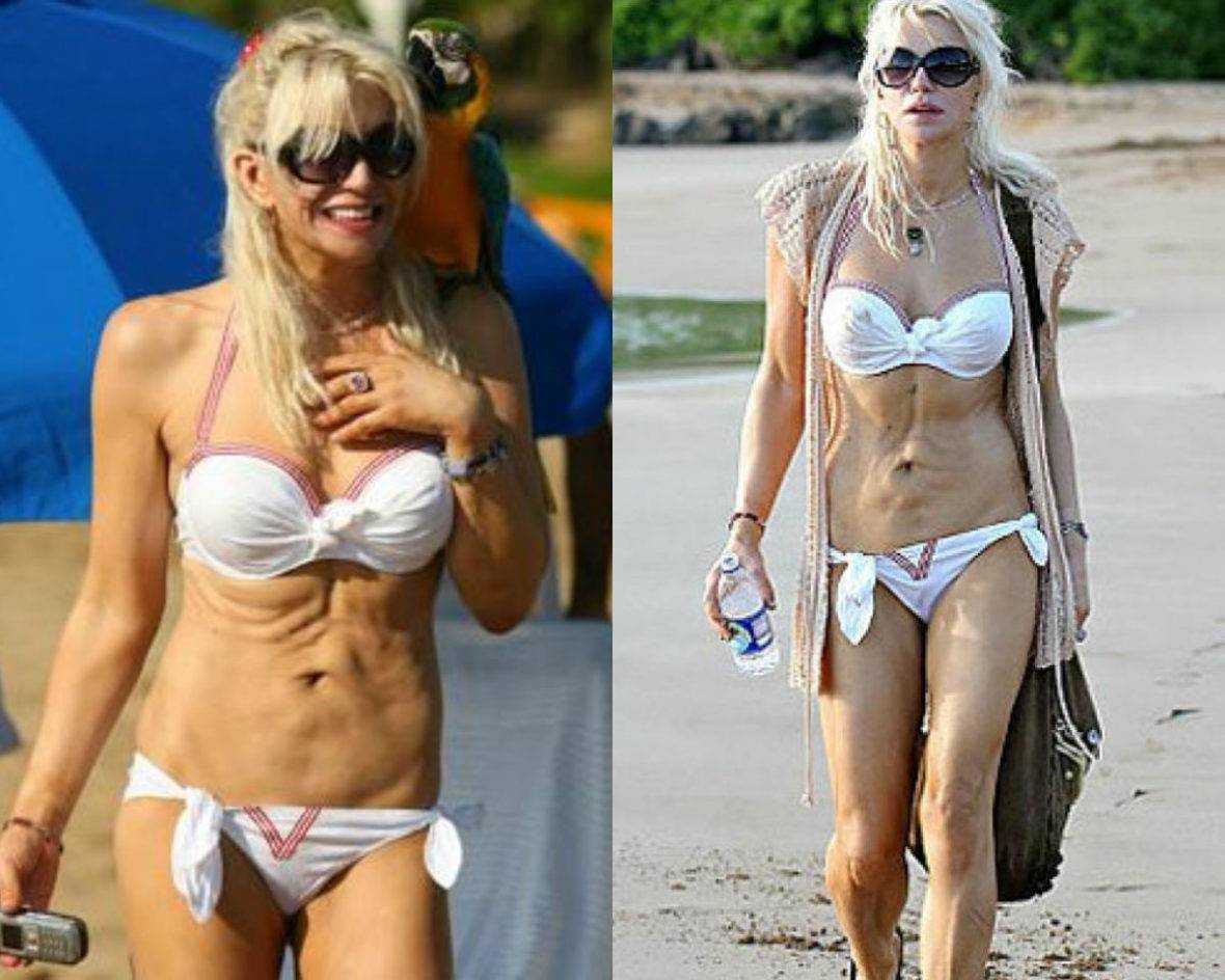 Тело 51 летней вдовы Курта Кобейна нельзя назвать идеальным. И хотя Кортни утверждает, что ей самой удалось скинуть лишний вес, сидя на коктейлях для похудения, многие издания рассказали, что такой дряблый вид кожи знаменитости и ее анорексичная фигура – это всё последствия хирургической операции по удалению части желудка.