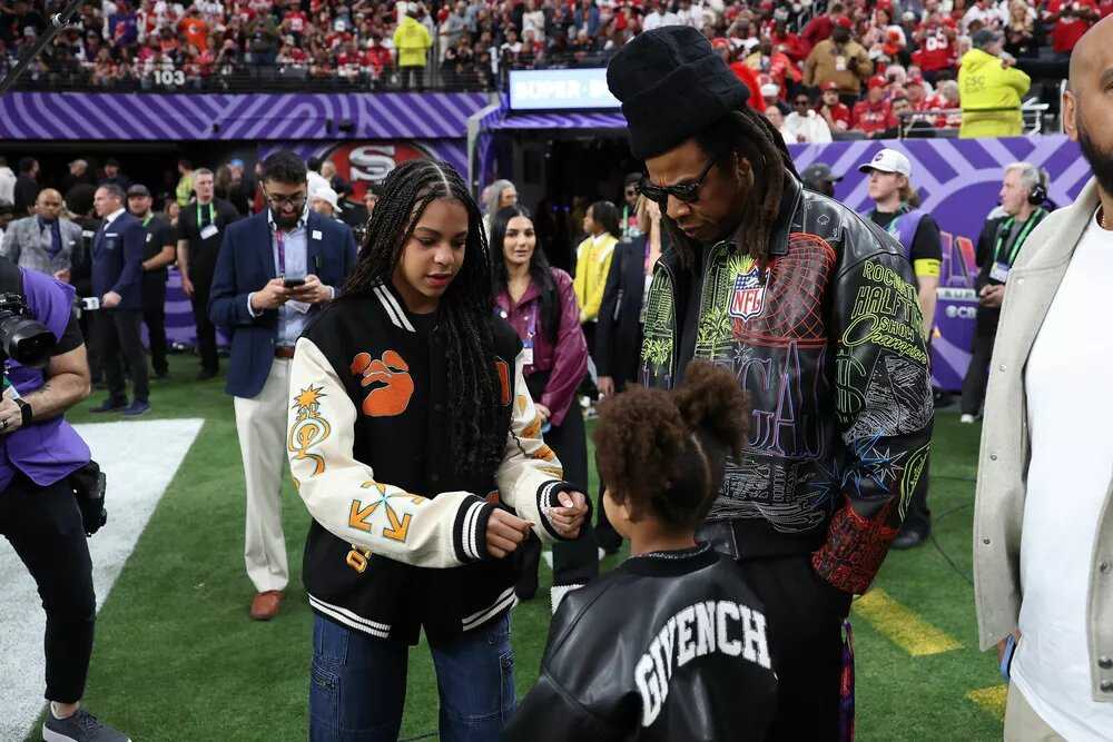 Рэпер Jay-Z любит американский футбол и на протяжении четырёх лет не пропускает Супербоул. Причём приходит не один, а вместе с семьёй. В этот раз музыкант появился в компании дочерей – 12-летней Блю Айви и 6-летней Руми. Правильно, к спорту надо приучать с детства.