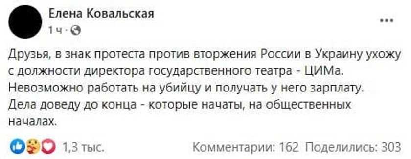 Директор московского Центра имени Всеволода Мейерхольда Елена Ковальская заявила, что уходит с этой должности «в знак протеста против вторжения России в Украину».